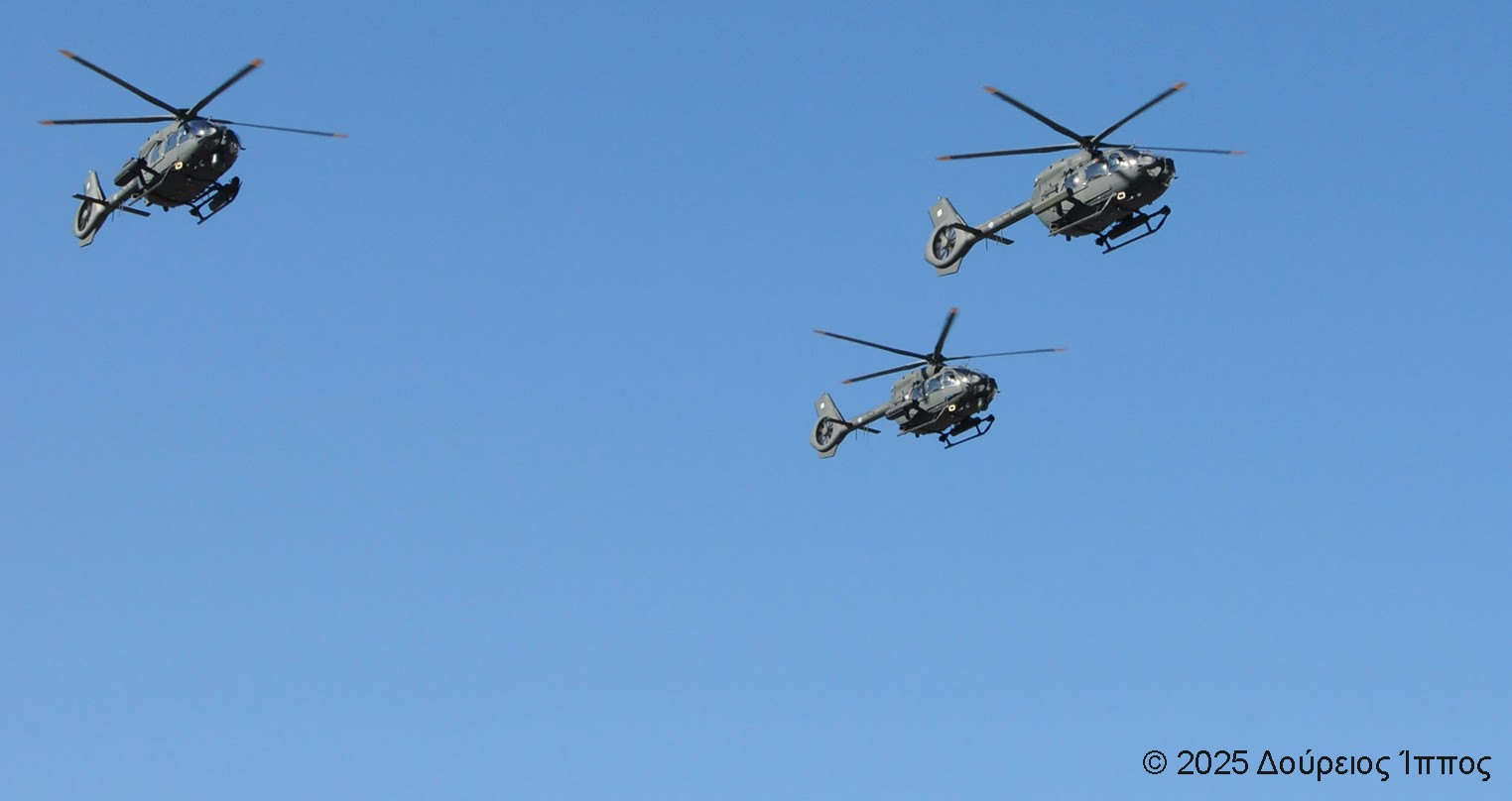 Κατά τη διάρκεια της παρέλασης πραγματοποιήθηκε διέλευση ελικοπτέρων στην οποία παρουσιάστηκαν, για πρώτη φορά, δημόσια τρία από τα νεοαποκτηθέντα εξοπλισμένα ελικόπτερα Η145Μ, τα οποία δύνανται να φέρουν οκτώ αντιαρματικούς πυραύλους με βεληνεκή πέραν των 10 χλμ. Η σύμβαση προβλέπει τη απόκτηση έξι ελικοπτέρων με δικαίωμα προαίρεσης άλλων έξι ώστε ο συνολικός αριθμός τους να ανέλθει σε 12.